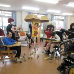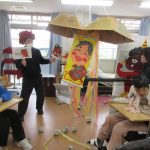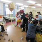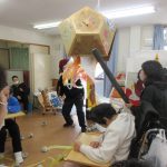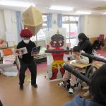 フレンズチームは、新聞紙で恵方巻を模して作ったロング恵方棒と、新聞紙の福豆で迎え撃ちます。 😉