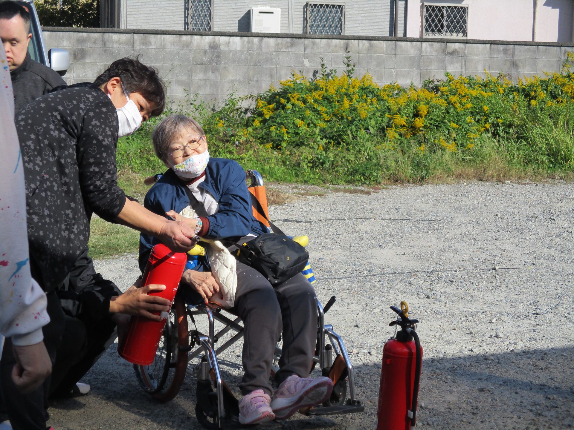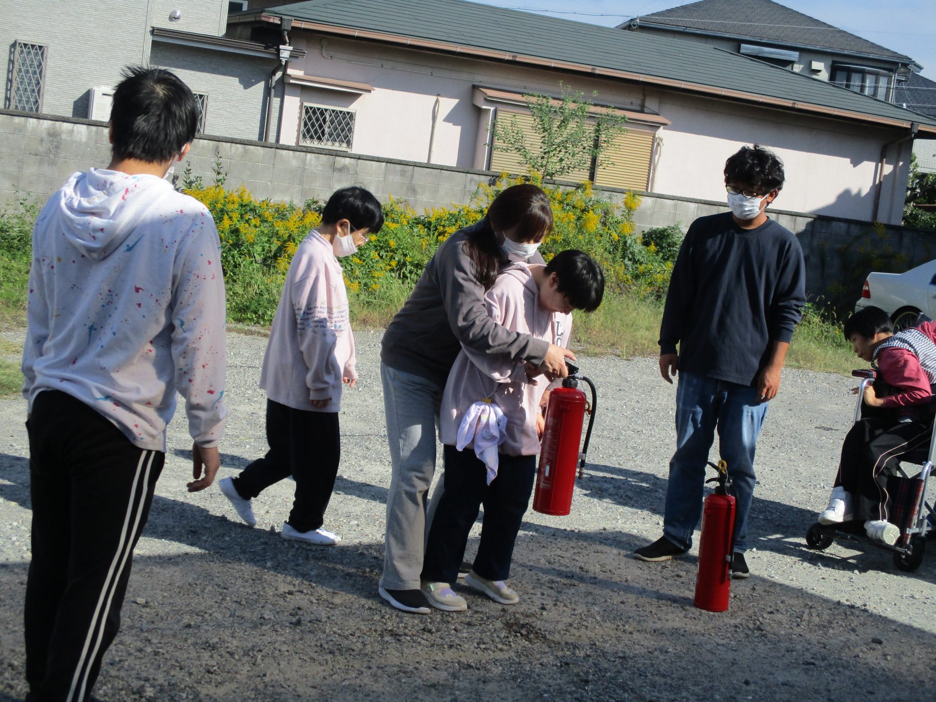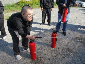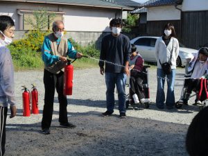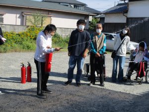 避難後は、職員と利用者のみなさんで水消火器を使った