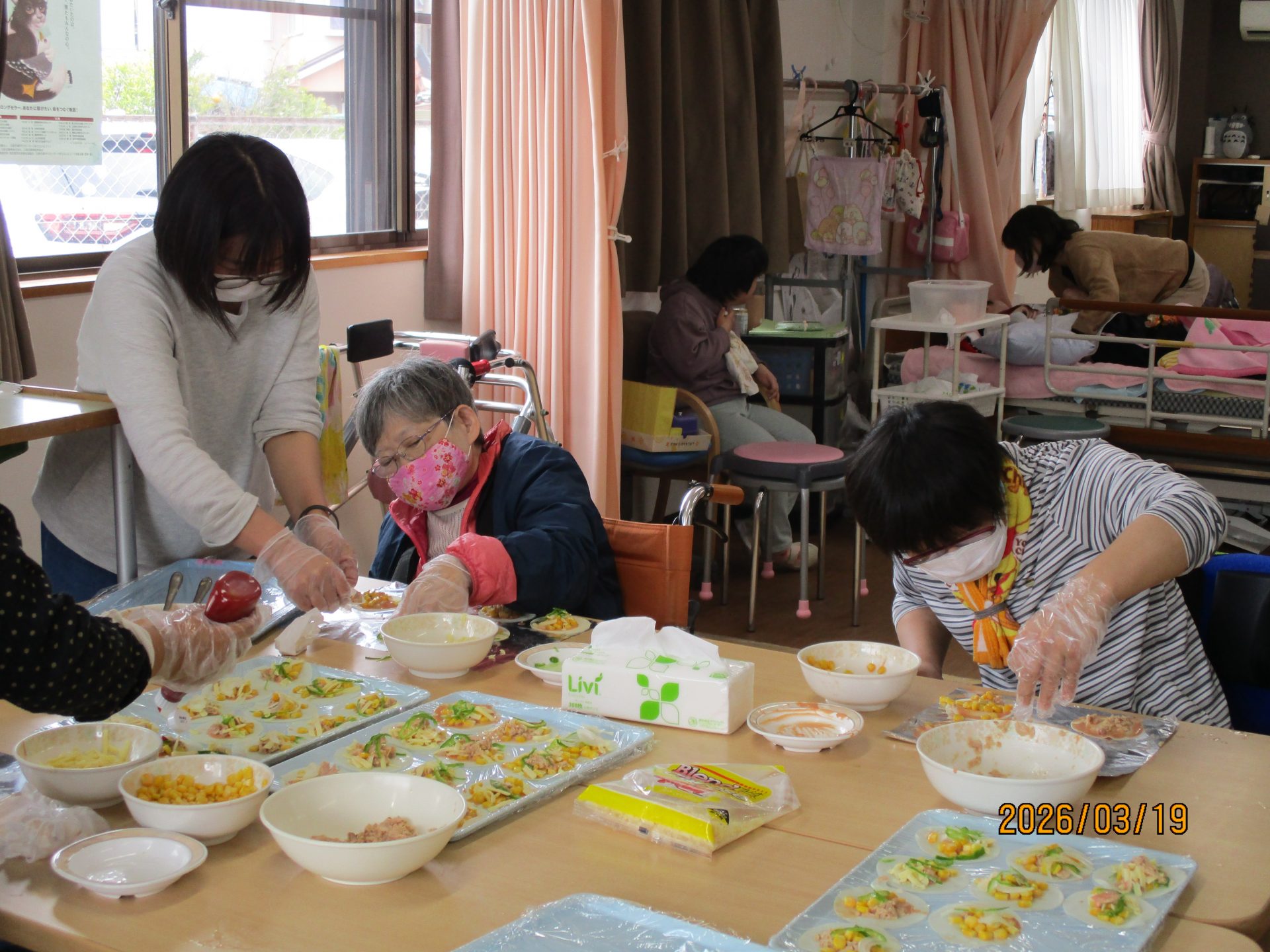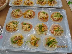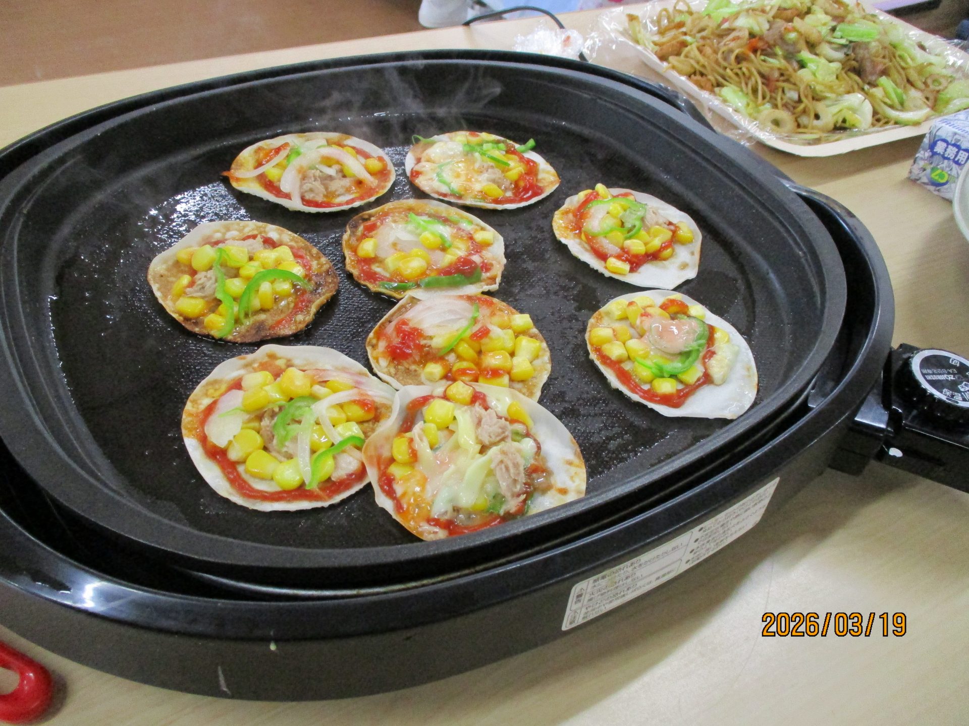 室内ではホットプレートで餃子の皮ピザや焼きそば、
