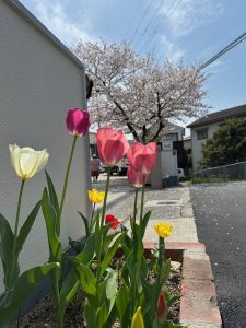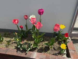 昨年度の室内グループさんが植えてくれたチューリップが綺麗に咲きました。