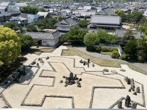 岸和田城の庭園(八陣の庭)は上空からの鑑賞を意図して設計された独創的なデザインで国の名勝に指定されているとのこと。