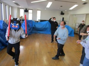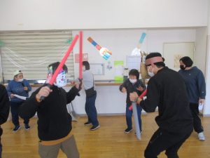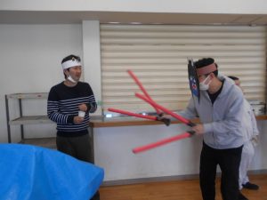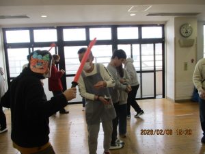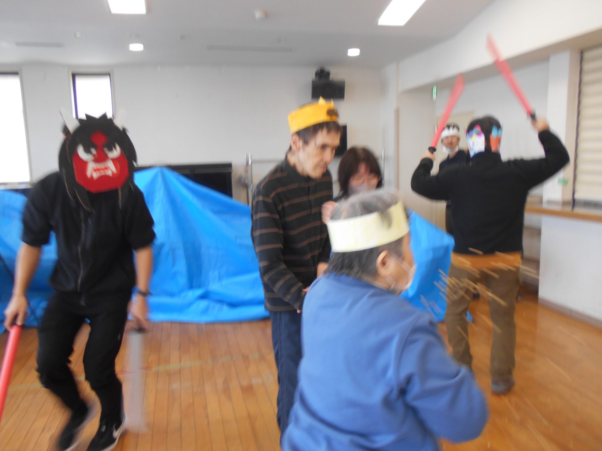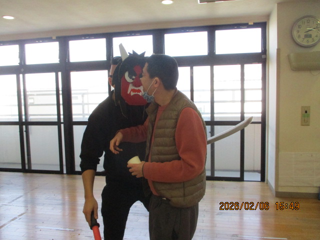行事係のご利用者の「鬼は外!」「福は内!」という元気な掛け声聞こえると、驚いていたご利用者も鬼に向かって豆を投げていました 😛