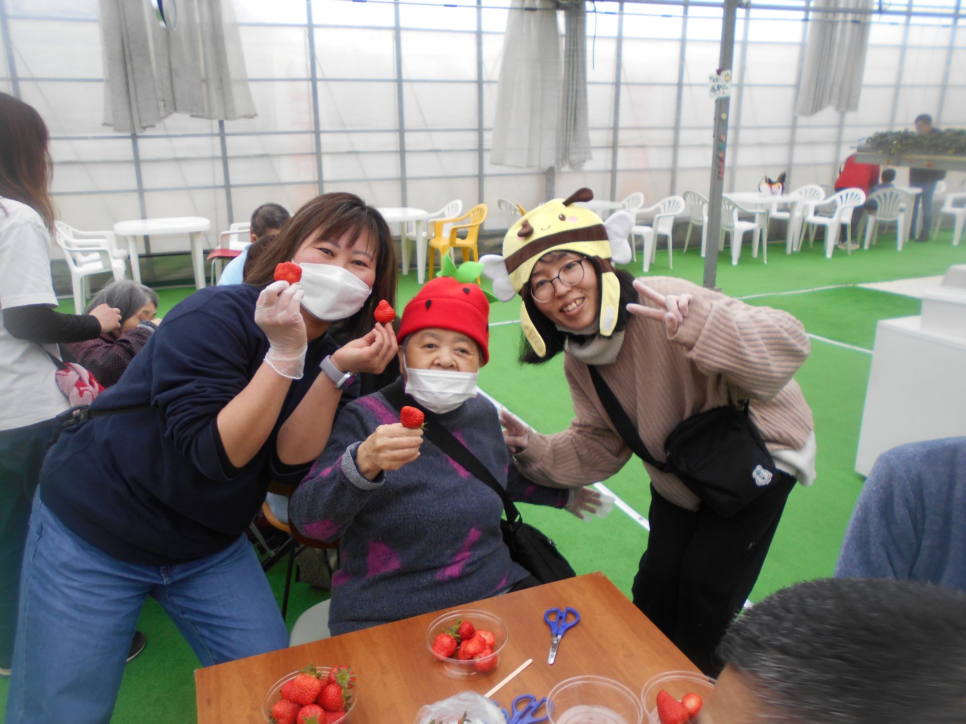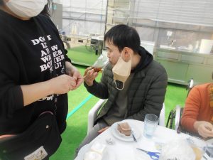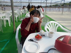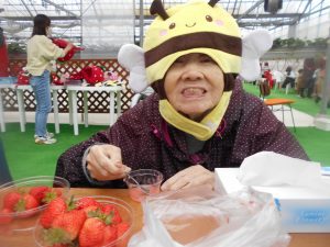ご自身で摘み取ったもぎたてのいちごの味は格別だったようで、あっという間にお腹いっぱいになるまで堪能されていました。外出先での皆さんの弾けるような笑顔と、普段とは少し違うリラックスした表情を見ることができ、職員にとっても大変嬉しい時間となりました。
